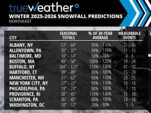 The northern tier of the United States, stretching from the Northern Rockies through the Upper Midwest and Great Lakes into the Northeast, also appears poised for a solid winter. Locations including Minneapolis, Fargo, Detroit, Grand Rapids, and Buffalo are all forecast to experience above-normal snowfall, while Boston and Providence could also trend higher, signaling potential for coastal storms when storm tracks align.
